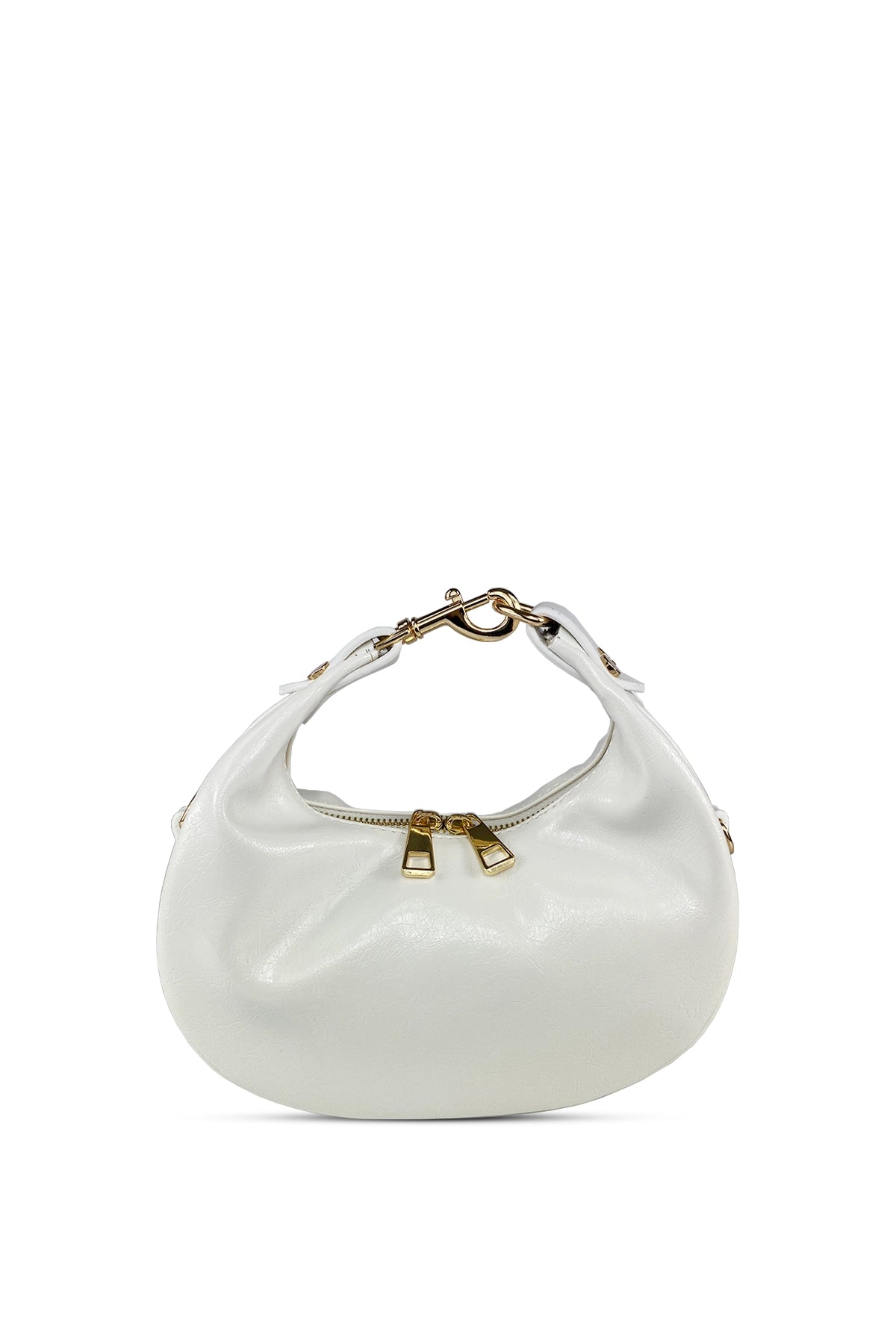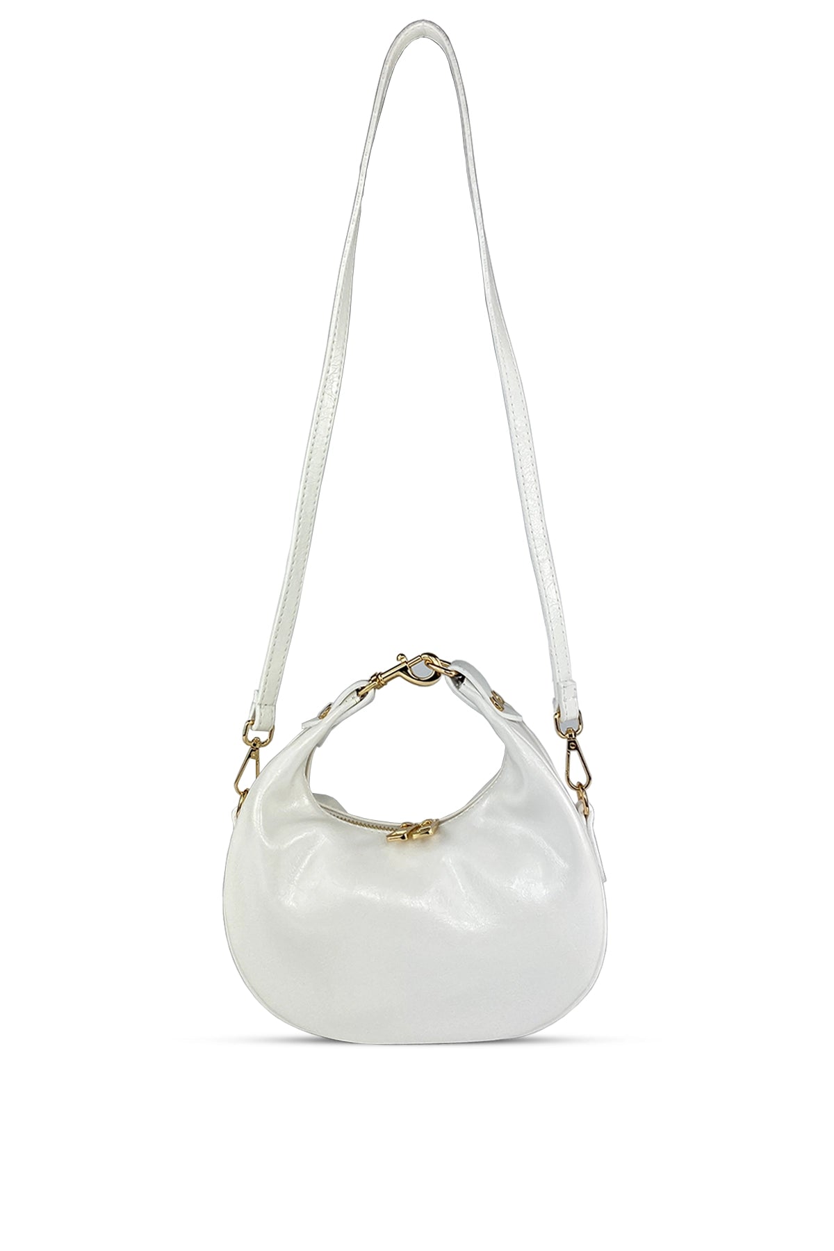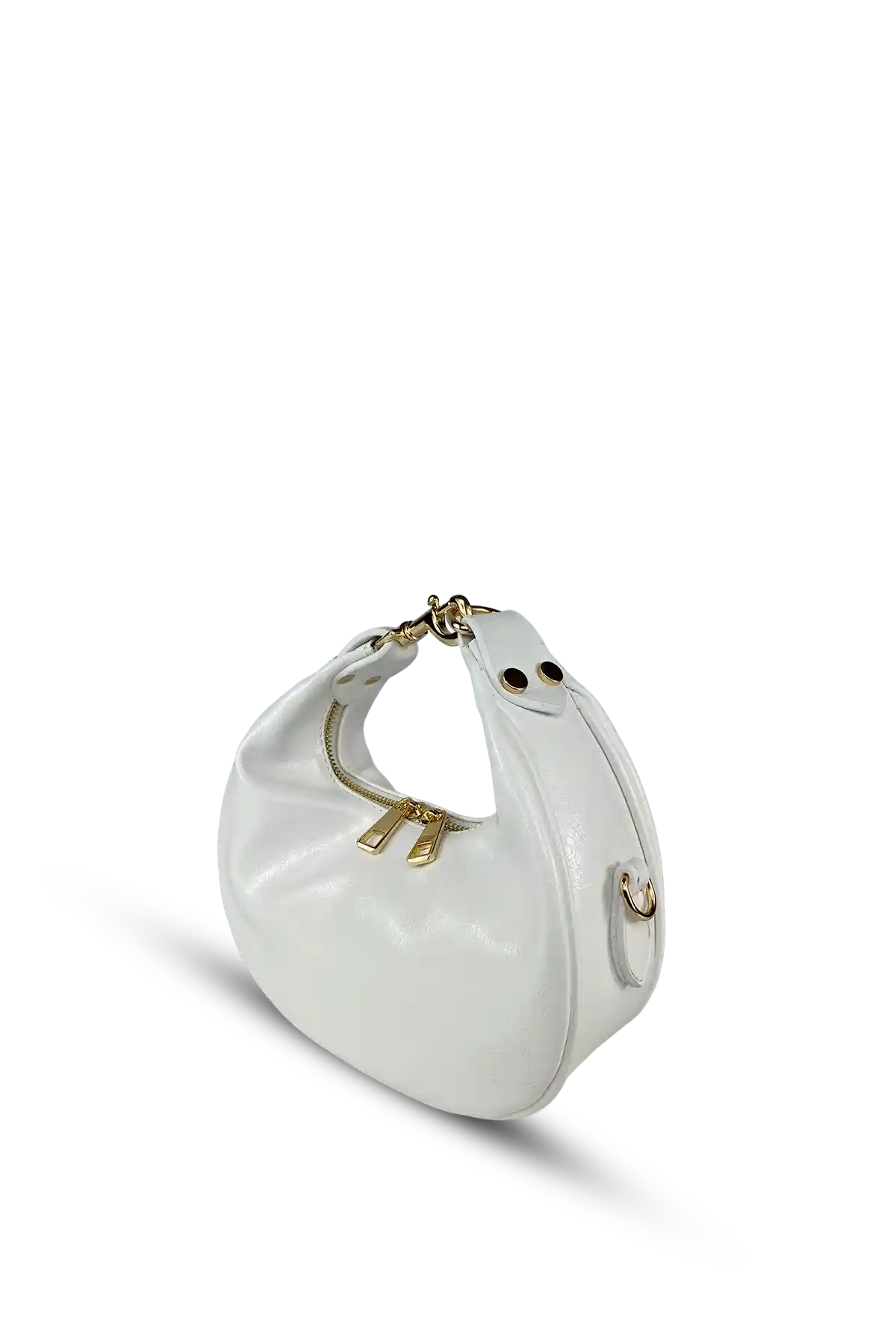 Sedef beyaz tonuyla her mevsim stilinizi aydınlatan bu kadın omuz çantası, altın renk metal detayları ve yumuşak kıvrımlı oval formuyla modern zarafetin tanımını yeniden yapıyor.