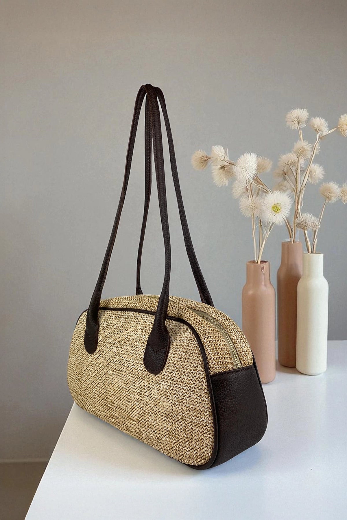 Doğallığın şıklıkla buluştuğu Siena, yaz mevsiminin vazgeçilmezi olacak. Örgü dokulu hasır yapısı ve zarif kıvrımlarıyla şehir stiline doğal bir dokunuş katar. Hafif yapısı sayesinde gün boyu konfor sunarken, kahverengi ince omuz askıları çantaya sofistike bir denge kazandırır.